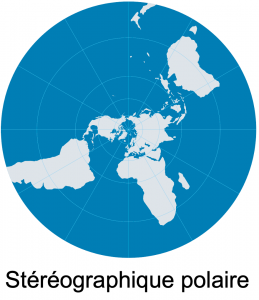 La projection se fait sur un plan tangent (ou sécant) à un point, souvent centré sur un pôle ou un point stratégique.